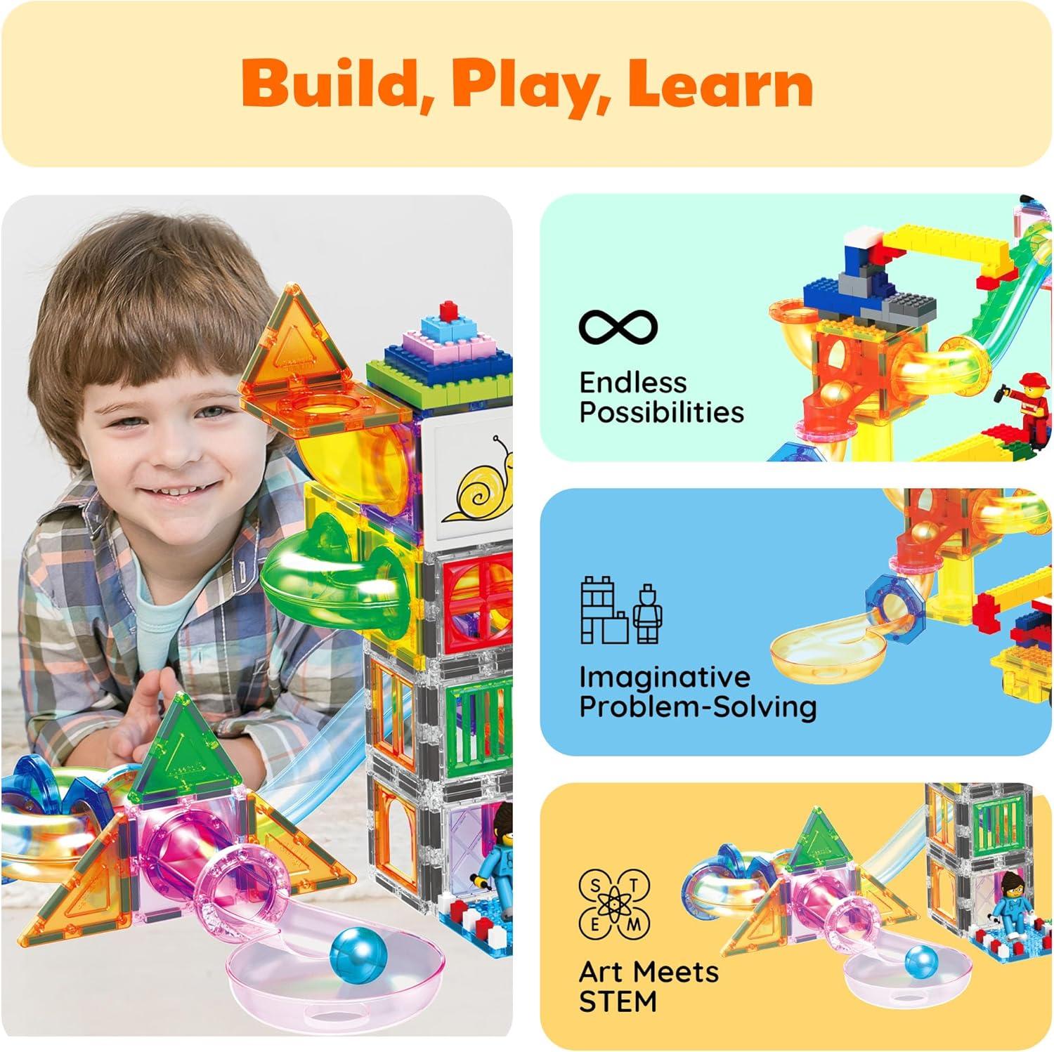 HANDS-ON STEM ADVENTURE! Essential magnet toys for kids age 3 and up! Develops problem-solving, spatial reasoning & fine motor skills through marble physics, magnetic construction, and creative design. STEAM learning made captivating!