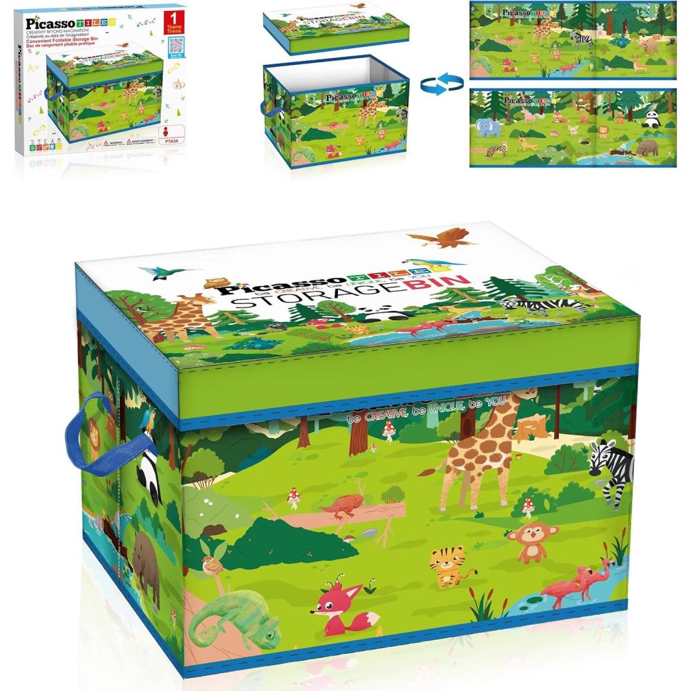 PicassoTiles Magnet Tile Toy Organizer Foldable City Theme Storage Bin Box with Lid and Handles Magnetic Tiles Building Blocks STEM Educational Pretend Play Playroom Toys Toddler Kids Ages 3 Up PTA33(Forest Animal Theme)
