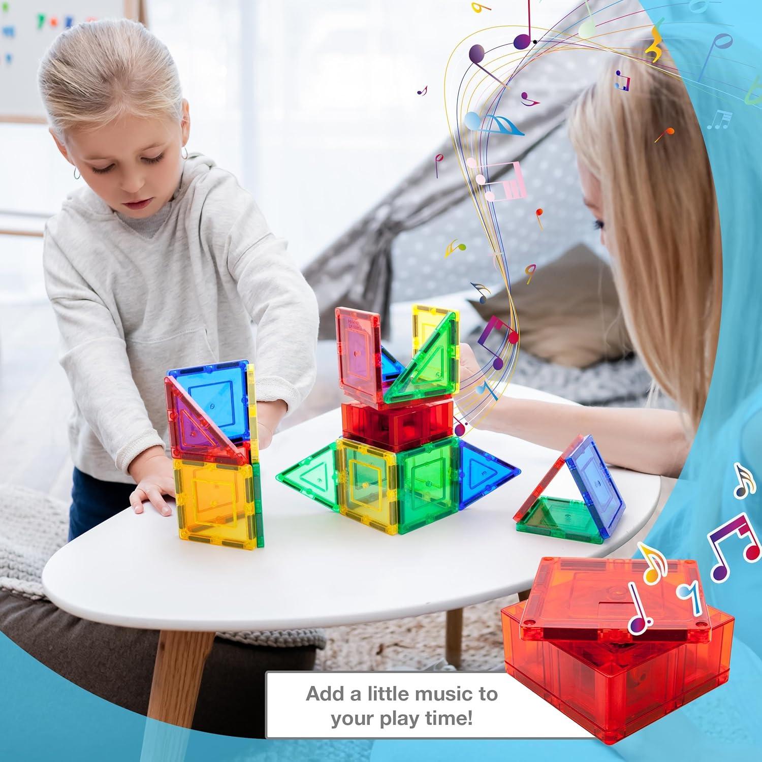 “Play Beyond Boundaries: Compatible with your existing magnetic building block tile sets, these Music Box tiles seamlessly integrate to expand your magnetic world. Discover a harmonious blend of innovation and entertainment for hours of joyful exploration.